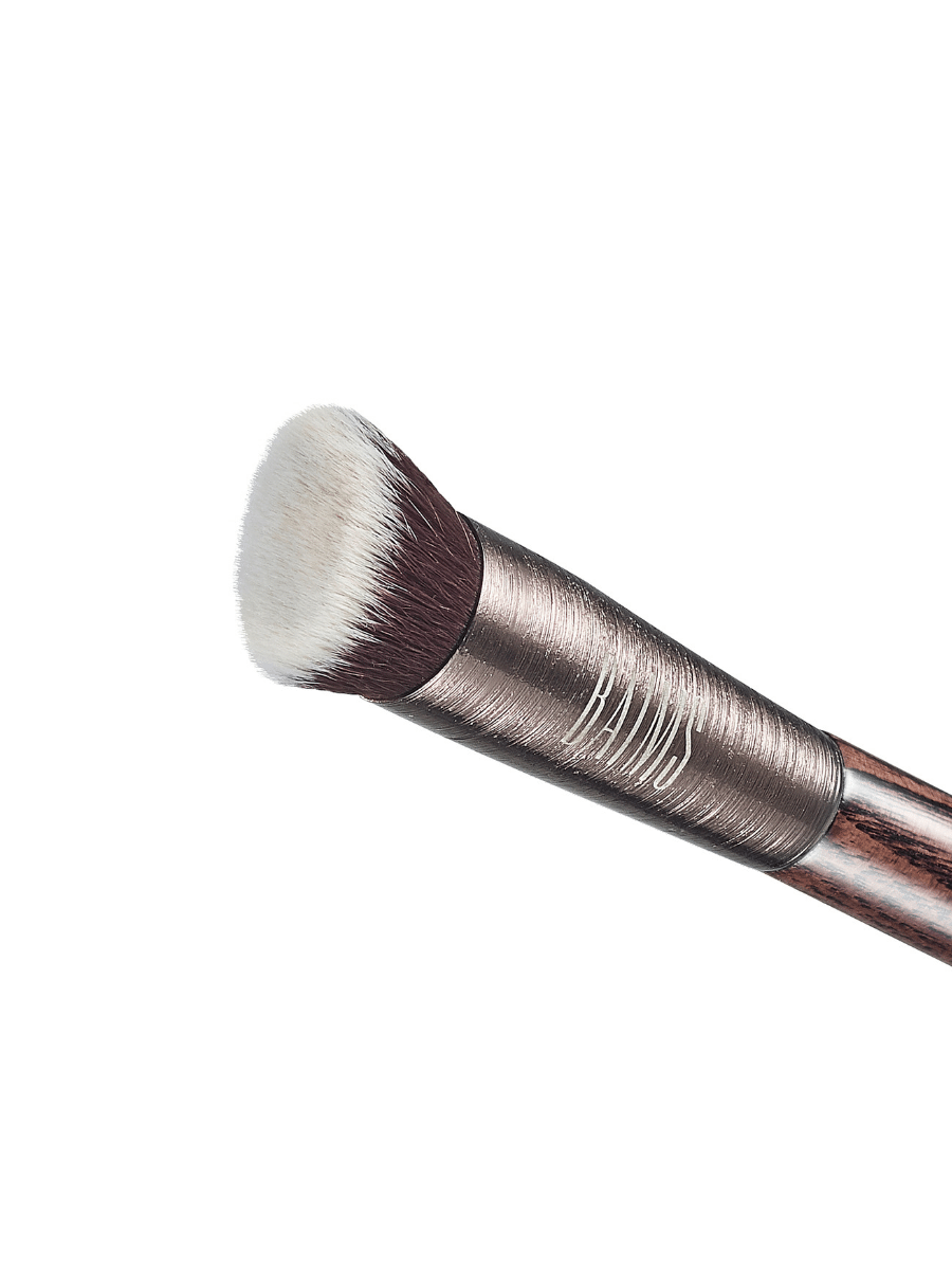 Baims 50 Mini Angled Kabuki är en handgjord vegansk silkesborste av högsta kvalitet gjord av taklonhår (syntetiskt hår). Sminkborsten är skapad med återvunnet aluminium med en borstad ytbehandling med ett naturligt trähandtag. Mjuk borste som liknar äkta hår, är lätt att rengöra och kan hålla i flera år om den används omsorgsfullt och rengörs noggrant och på rätt sätt. Syntetiskt borsthår är lättare än rengöra och mer hygieniskt än djurhår eftersom bakterierna inte kan kolla sig kvar lika lätt som på djurhår.