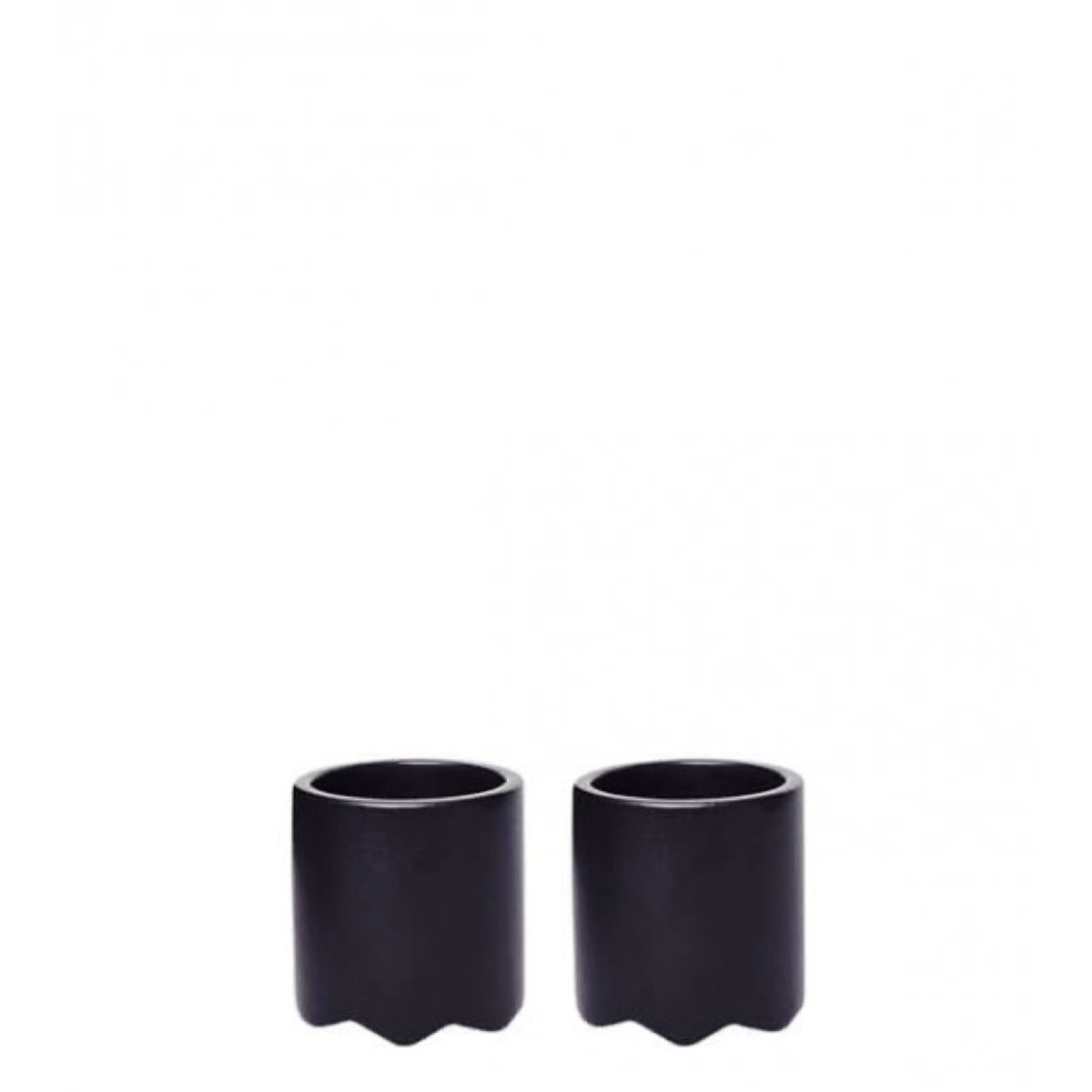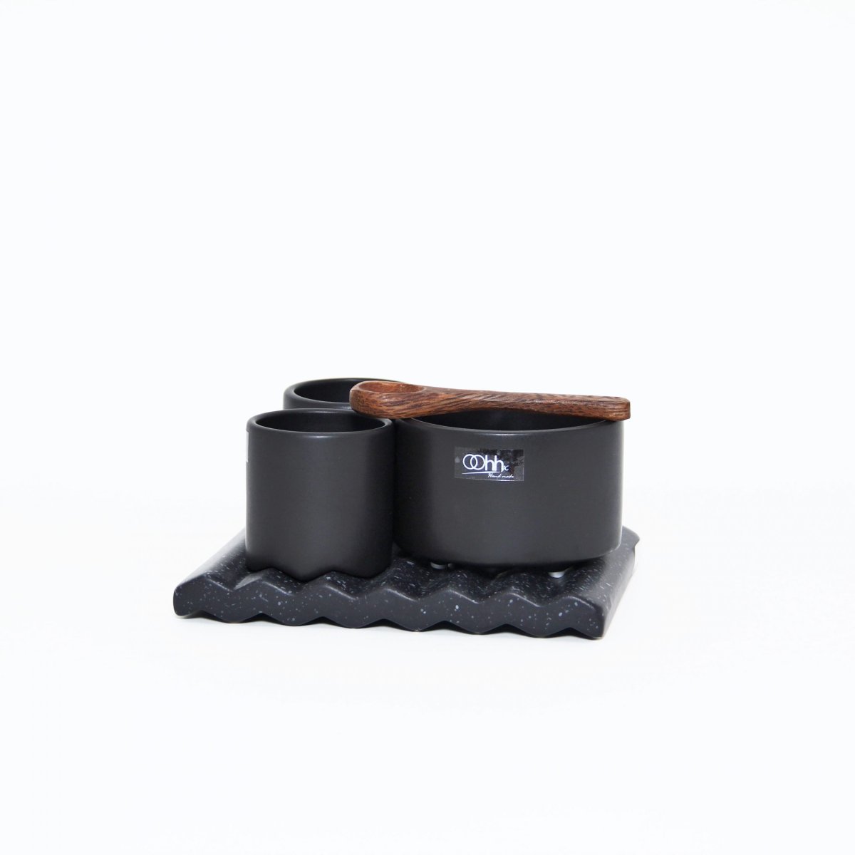 Ingår ett svart vågat fat som är 10 x 14 cm, två svarta äggkoppar, en svart salt skål och en snygg saltsked i trä.