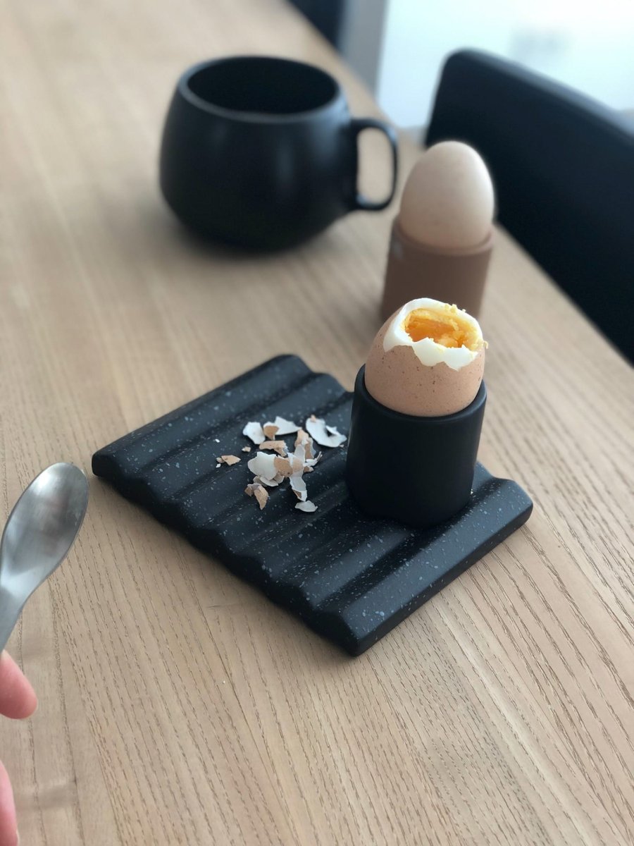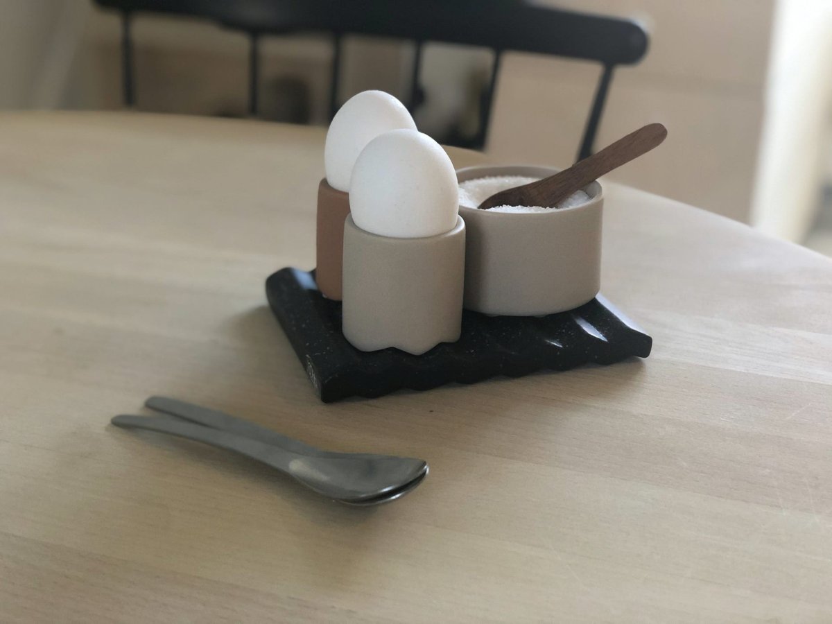 Äggkoppar för två i keramik som är producerad genom användning av solenergi och återanvändning av vatten från en jordbruksindustri från omgivningen. Två snygga koppar med en liten serveringsbricka där båda äggkopparna och skålen för tex salt eller örtsalt får plats. En snygg liten träsked som är perfekt för tex saltet eller andra kryddor. Ett perfekt set för frukost med ägg, eller kanske för att krydda sin avokadomacka med ägg. Men det går utmärkt att ha setet som kryddset om man inte vill använda det som ägghållare.