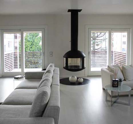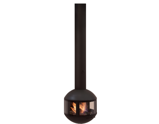 Denna skickligt utformade modell är frihängd så att dess riktning är justerbar, men den kan också låsas i ett läge. Dess design med glasrutor gör att man kan se elden från alla håll.