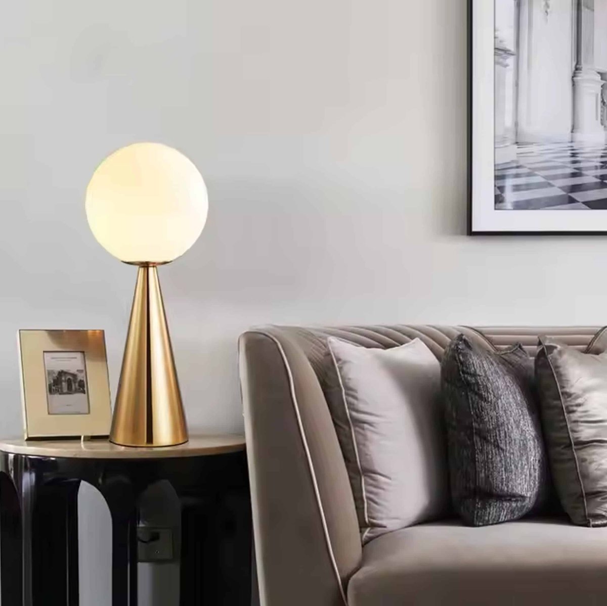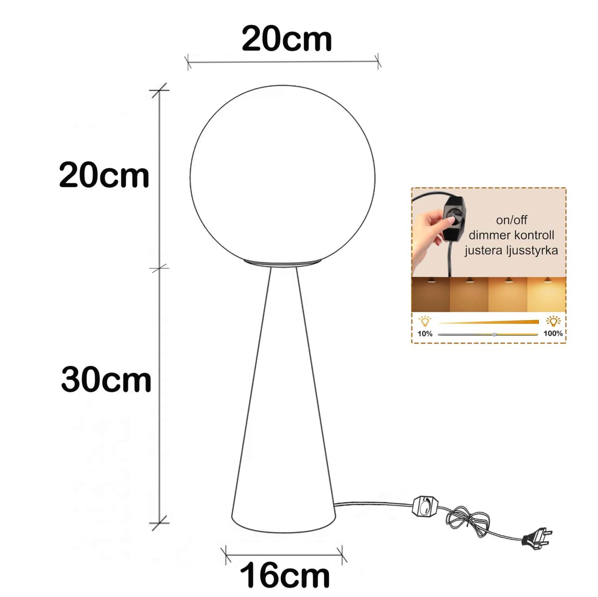 Det sfäriska klotet lyser upp rummet med ett mjukt välkomnande sken och ger en skön proportion till resten av ditt möblemang. Bordslampan är modern i sitt uttryck och ger en stilren postmodern estetik till rummet samt en gnutta artisteri och ädel kreativitet.