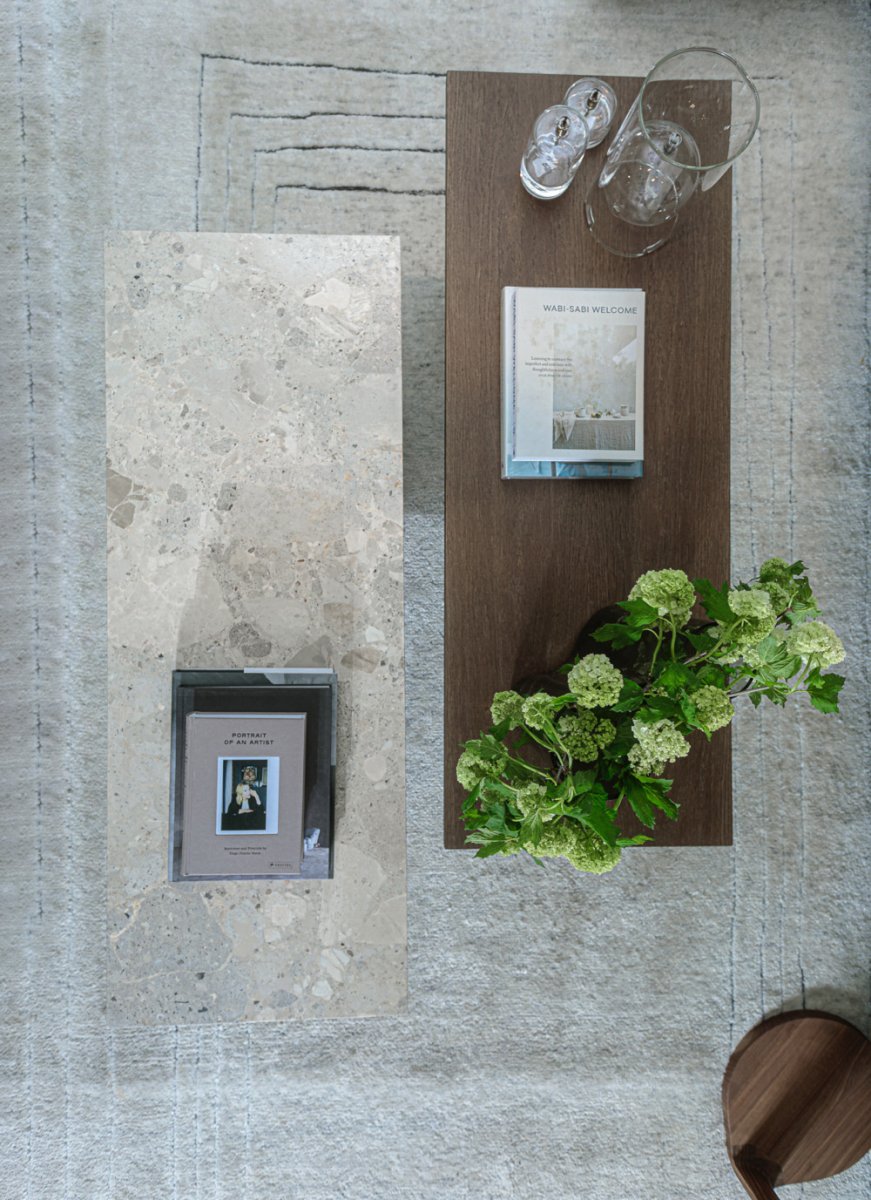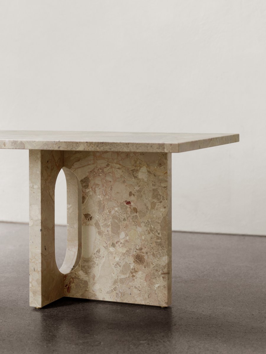 En monumental design tillverkad av kunis breccia -sten, markerad med karaktäristiska ådror och mineralfragment i varma nyanser. Den mångsidiga designen gör det möjligt att använda både som loungebord eller bänk för högar med böcker och dekorationer.
