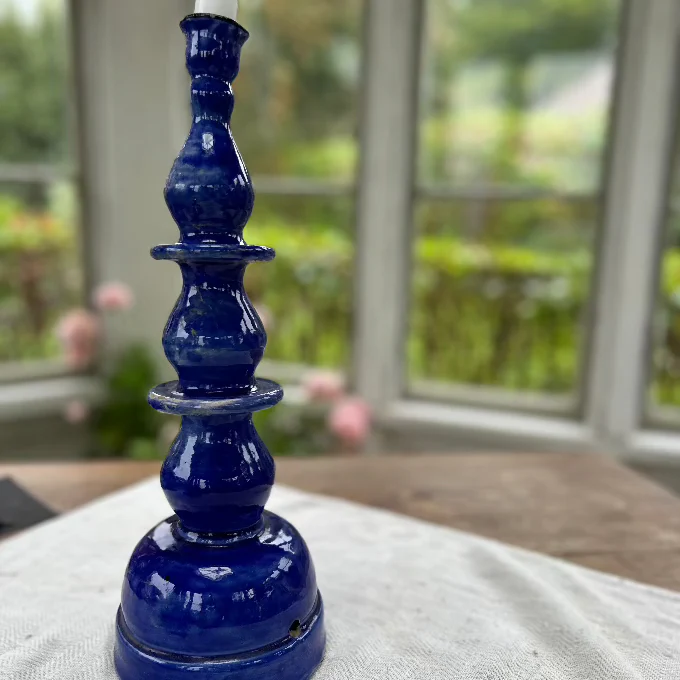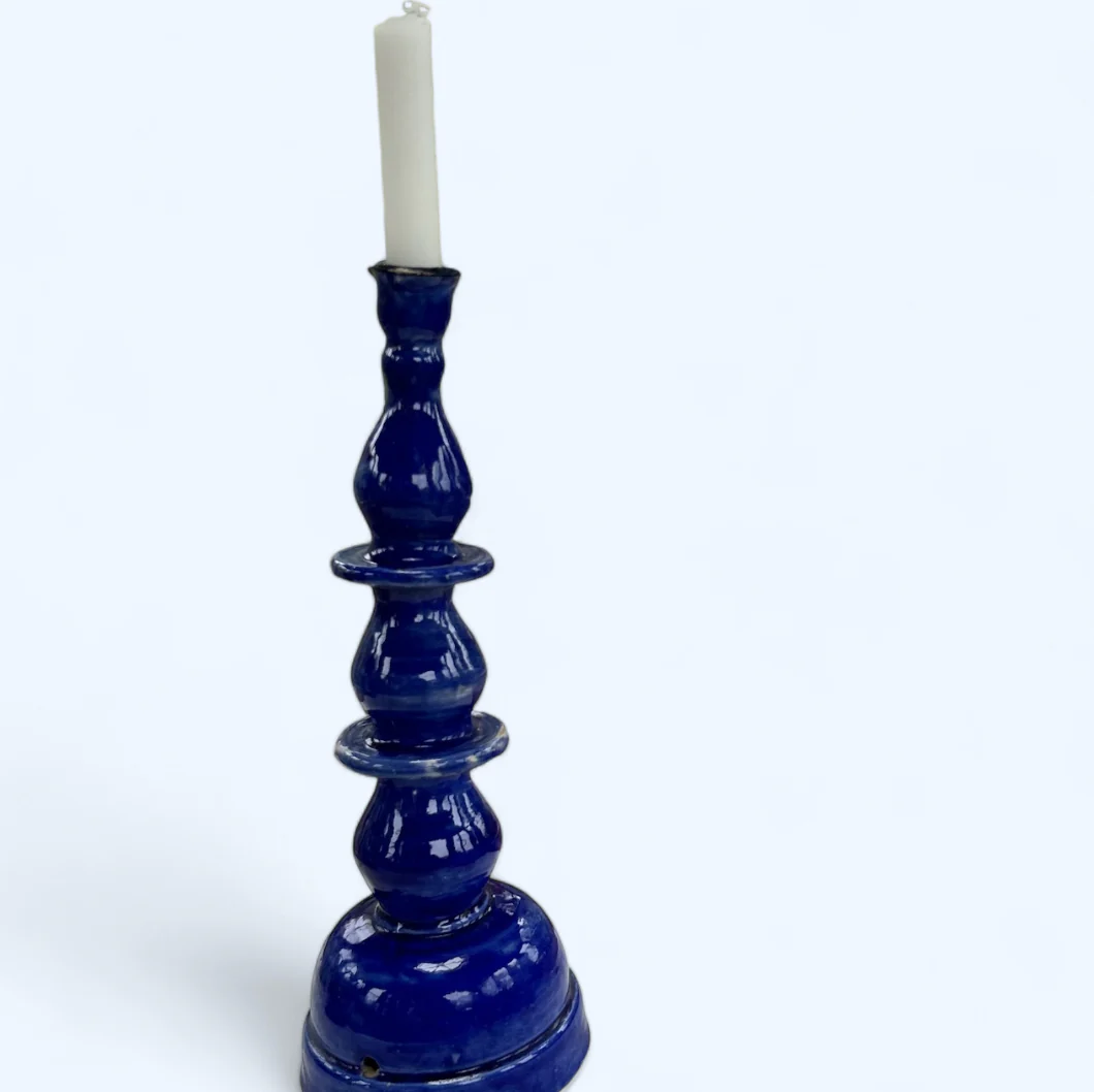 En antik ljusstake i keramik från Marocko – handgjord och målad i djupblå nyanser med traditionella marockanska mönster. Den skapar en varm och genuin stämning i ditt hem, oavsett om du tänder ett ljus eller låter den stå som en dekorativ detalj.