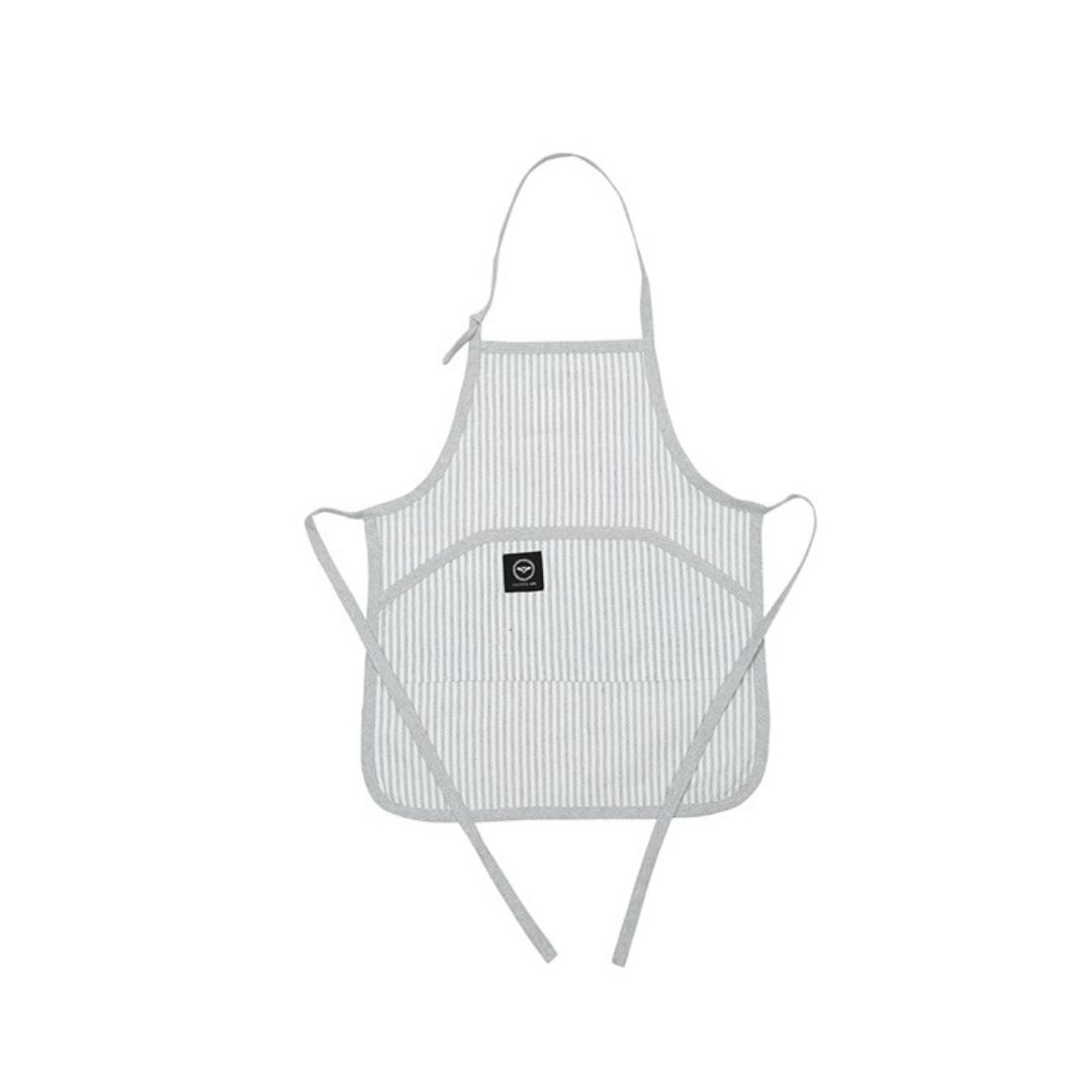 En grå vit randig barnförkläde av återvunnen textil. Med ett band som knyts runt midjan och nacken, är det enkelt att justera passformen. Förklädet har även två fickor som gör att den känns mer användbar.