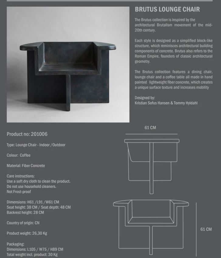 BRUTUS är en modern möbellinje av gjutna betongmöbler. BRUTUS-kollektionen kännetecknas av dess raka skulpturala utseende, inspirerad av arkitektur från mitten av 1900-talet. Alla produkter är gjutna i lätt fiberbetong. Varje bit är handmålad med flera lager färg, vilket skapar en stark och beständig yta.