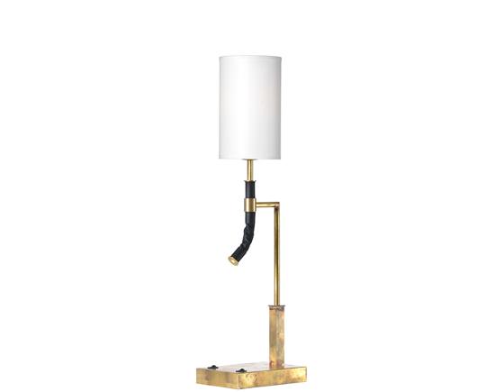 Bordslampa med stomme i rå mässing/svart läder eller svartlackerad stål/svart läder.