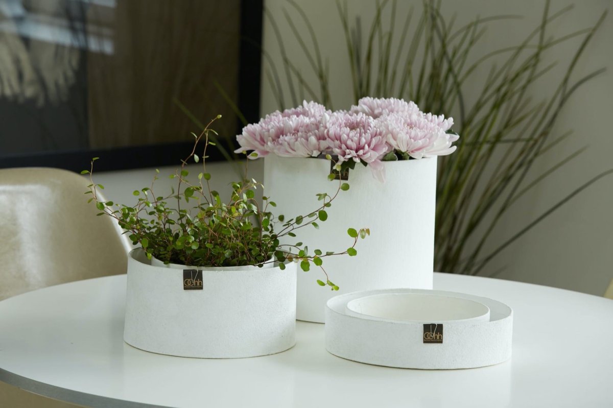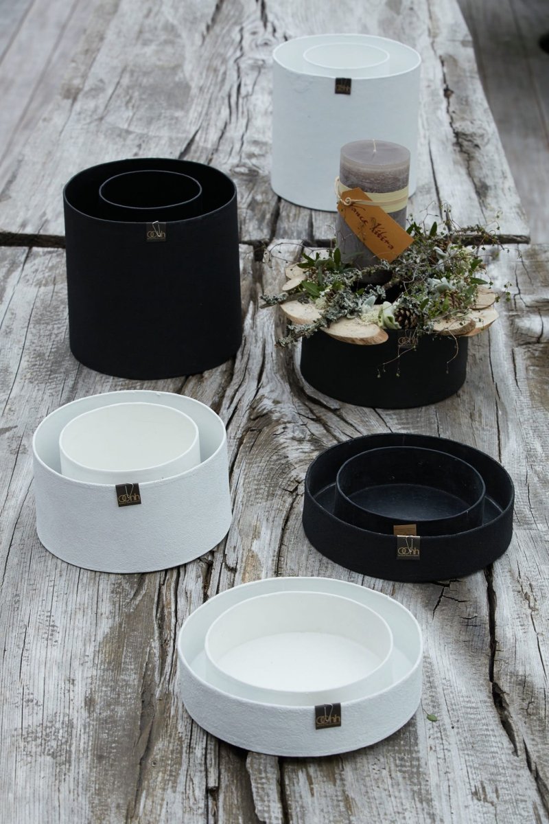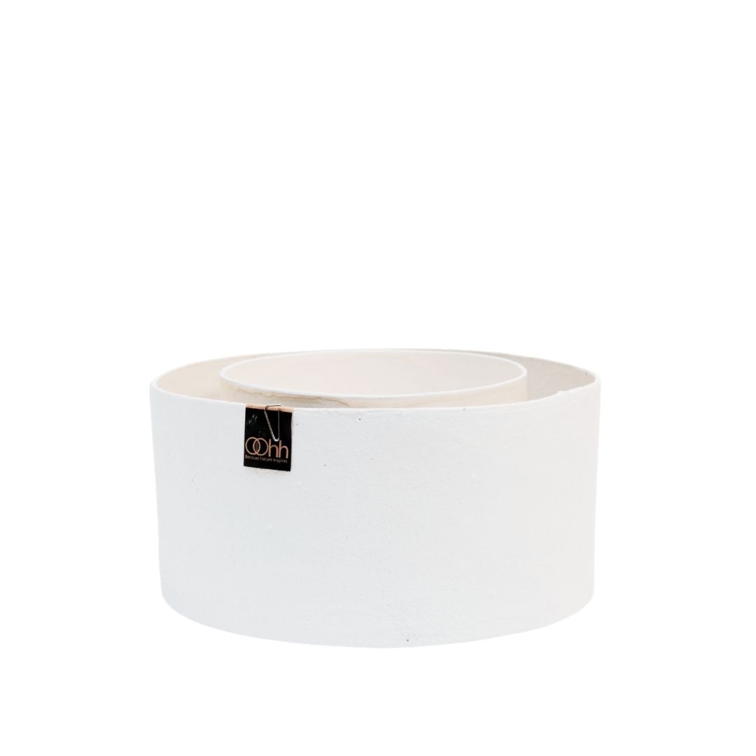 En handgjord dubbel kruka gjord av 100% återvunnet material. Krukan är gjord av återvunnet papper och har en ”sand finish”. 100% vattentät.