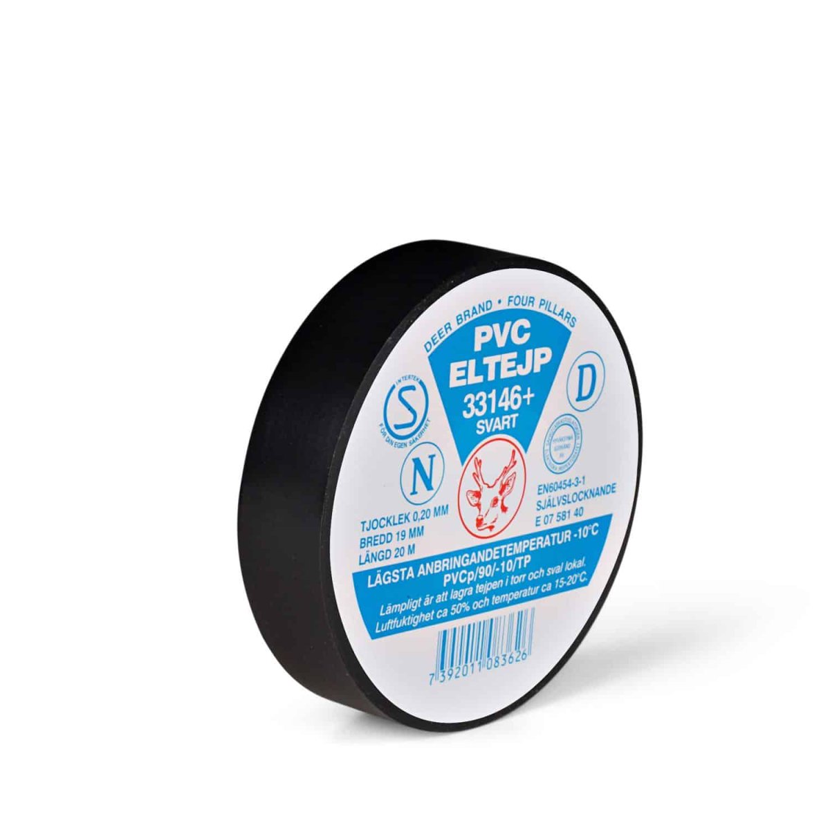 Certifierad isoleringstejp av högsta kvalitet. Uppfyller kraven för S-märket, en europeisk symbol för säkerhet, och är därför ett utmärkt val för säker isolering av elinstallationer. God filmflexibilitet och vidhäftning. etab 33146+ eltejp är gjord av mjuk PVC. En pålitlig isoleringstejp som är lämplig för elinstallationer samt för buntning av kablar, skarvning och märkning. Genomslagshållfasthet 10 000 volt. Lägsta pålindningstemperatur -10°C. 19 mm x 20 m