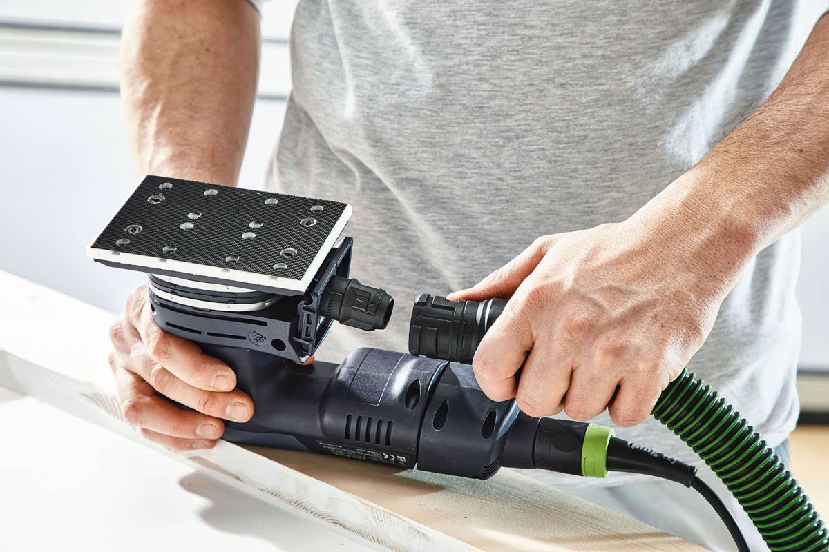 - Med plug it-nätadaptern som slipmaskin med obegränsad drifttid i kontinuerlig eldrift – perfekt i kombination med en Festool dammsugare inomhus