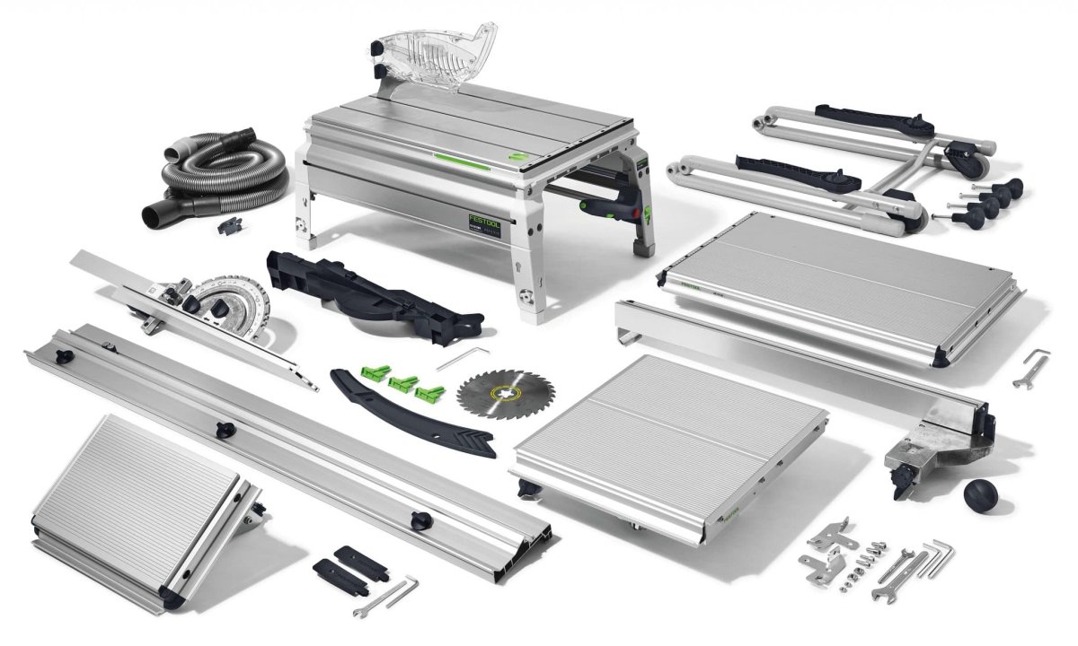 HW universalsågklinga W32, Vinkelanslag, Längdanslag, Justerbord, Bordsförlängare, Bordsbreddare, Fällbara stödben, 3 x splitterskydd, Utsugsset, Påskjutare, Tillbehörsfack, Stöd med transporthjul, Insexnyckel NV 6.