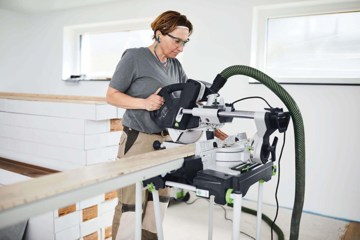 KAPEX KS 60 är perfekt för både byggarbetsplatsen eller altanbygget. Inga onödiga delar gör maskinen lätt och smidig. Den är enkel att transportera tack vare det ergonomiskt placerade bärhandtagen, kabelvindan och transportsäkringen. Eftersom styrstängerna inte sticker ut, blir maskinen mycket kompakt. Den kompromissar inte heller när det gäller precision och användbarhet, tack vare en geringsvinkel på upp till 60° och en lutningsvinkel på upp till 46° resp. 47° åt båda håll. Festools dubbelpelarstyrning med dubbla lager garanterar att sågklingan styrs säkert och friktionsfritt. Med finesser som LED-strålkastarljuset, den utdragbara bordsbreddaren, den extra notfunktionen och smygvinkeln är KAPEX KS 60 en fantastisk kombination av rörlighet, användbarhet och perfekta resultat.