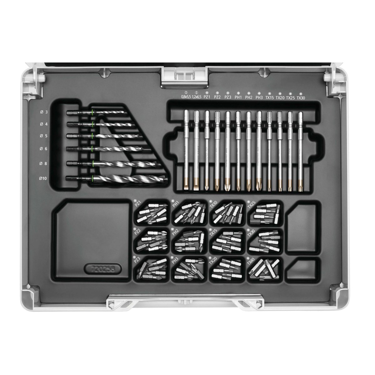 - 60 x 25 mm bits, vardera 5 st: PZ1/PZ2/PZ3/PH1/PH2/PH3/TX10/TX15/TX20/TX25/TX30/TX40