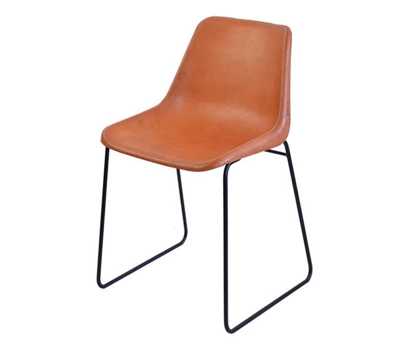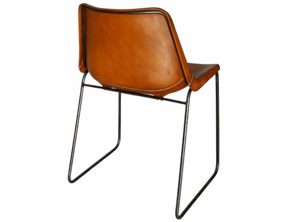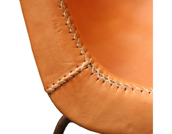 Sömnadsdetaljerna och det oljade lädret skapar en rustik kontrast till stolens slanka moderna järnsiluett och återkopplar till hantverkets genuina ursprung.