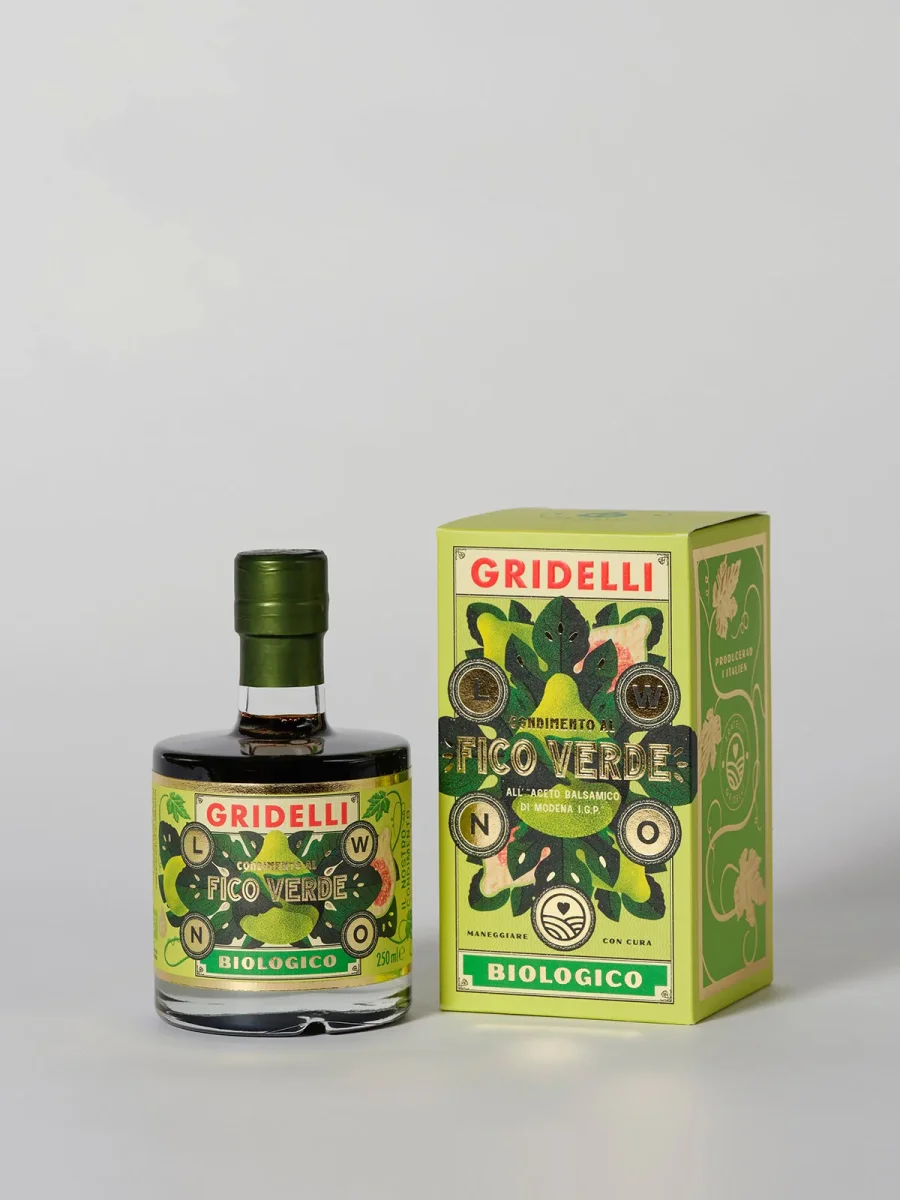 Gjord på ekologiska druvor från Emilia-Romagna och smaksatt med ekologiska gröna fikon. Innehåller 95,8% I.G.P.-klassad aceto balsamico di modena, 4% infusion av ekologiska gröna fikon och 0,2% naturliga aromer. Denna balsamico har en fruktig och frisk smak som påminner om sköna dagar i Italien. För oss betyder denna balsamico extra mycket då farmor hade ett stort fikonträd med gröna fikon i trädgården som vi åt av så fort vi hade tillfälle. En given balsamico att ringla över en fräsch sallad tillsammans med Gridelli olivolja. Extra god tillsammans med ost, till exempel en sallad med getost eller fetaost. Passar utmärkt till vinterns glöggkalas att kombinera med grönmögelost och pepparkaka.
