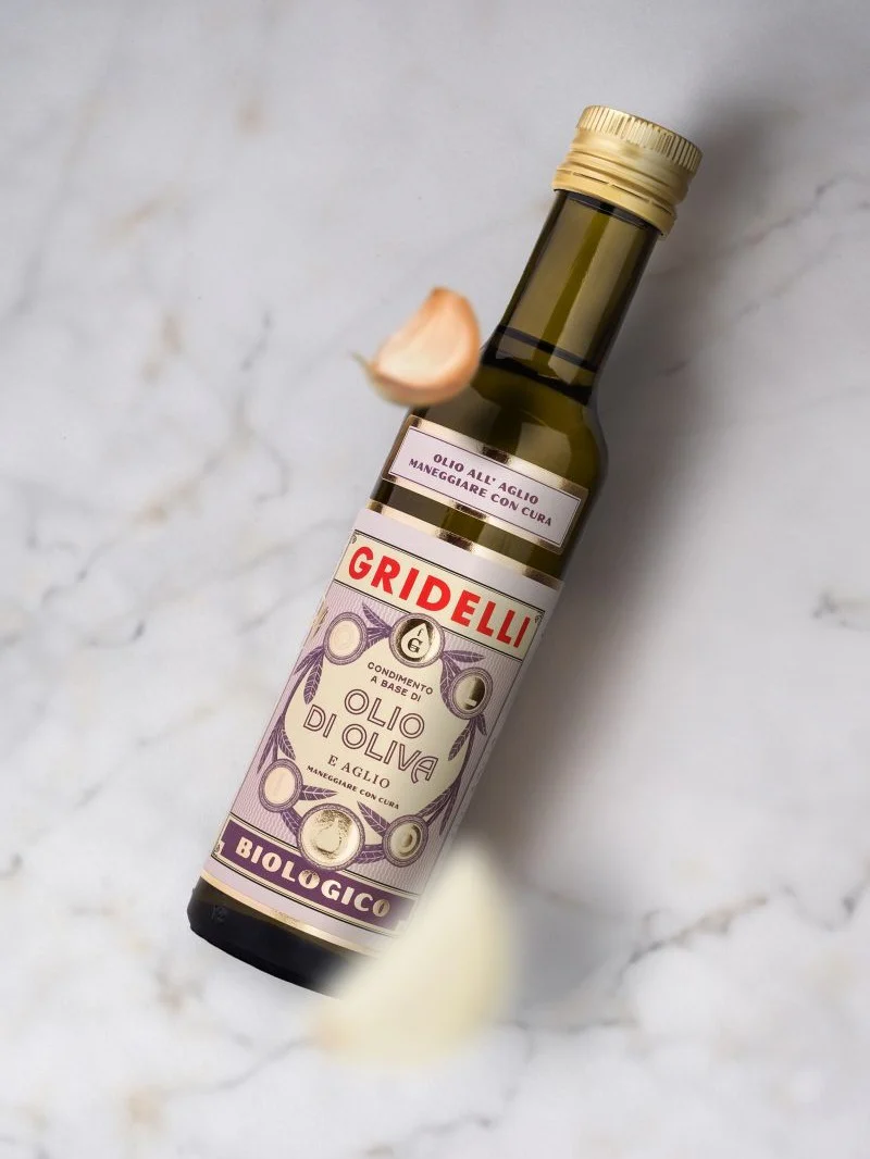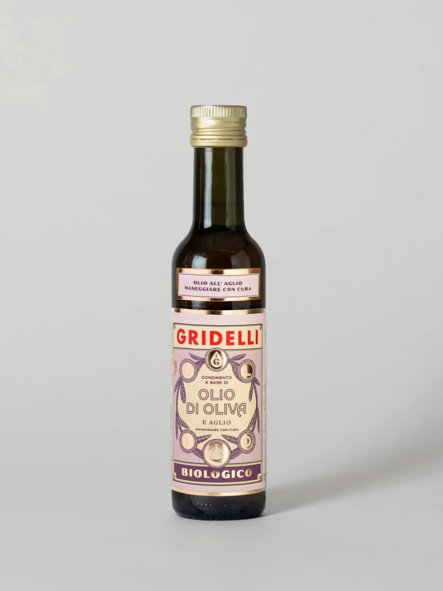 En ekologisk vitlöksolivolja från soliga Kalabrien. Olivoljan är av typen extra virgin och är gjord av olivsorterna Ottobratica och Carolea. Den innehåller 94% ekologisk olivolja och 6% ekologisk vitlök. Olivolja av vitlök ger rätter karaktär utan att vara överväldigande. Eftersom smaken är mer subtil än färsk vitlök kan den användas för att förhöja smaken på olika rätter utan att dominera helt.