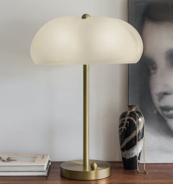 Kronan på verket är den delikata, men ändå motståndskraftiga frostade skärmen prydd med gyllene elegans, hålls samman av en mässingsknopp.