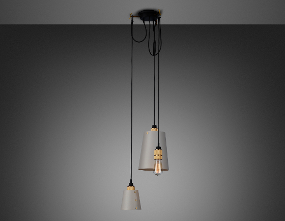 Exklusiv takarmatur, tre hängen med metalldetaljer samt en stor och en liten skärm i färg Graphite eller Stone. Med hjälp av specialdesignade krokar i matchande metall kan armaturen justeras efter egna önskemål. Krokarna kan plockas av takrosen och placeras i taket för att ytterligare kunna bestämma formen på sin egna armatur. Kabel och takros i matt svart gummi.