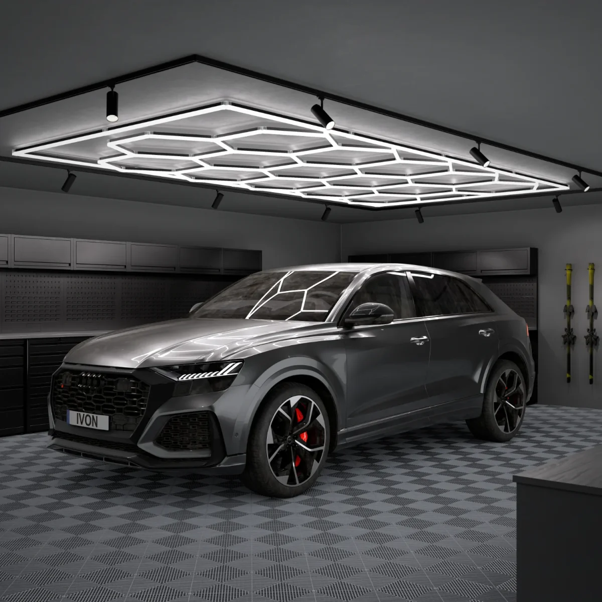 Ge ditt garage ett lyft med IVON® Hexagon-belysning. Med ett modernt honeycomb-mönster och ett kristallklart ljus med färgtemperatur 6000K skapar vår LED-armatur en exklusiv och funktionell miljö. Anpassningsbar storlek och enkel installation gör det lätt att skräddarsy ljuset efter just ditt garage. Upplev en WOW-känsla varje gång du öppnar garageporten.
