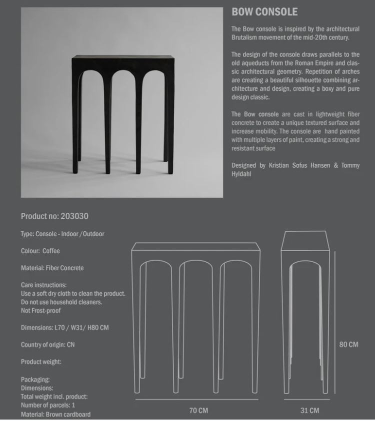 BOW är en modern möbellinje av fiberbetong. BOW kännetecknas av dess raka skulpturala utseende, inspirerad av arkitektur från mitten av 1900-talet. Varje bit är handmålad med flera lager färg, vilket skapar en stark och beständig yta. Formgivare: Kristian Sofus Hansen & Tommy Hyldahl