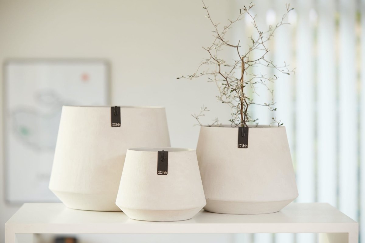 En handgjord kruka gjord av 100% återvunnet material. Krukan är gjord av återvunnet papper med en cement-finish. 100% vattentät. Perfekt till dina krukväxter och jättesnygg hållbar inredningsdetalj i hemmet som verkligen drar ögonen till sig.