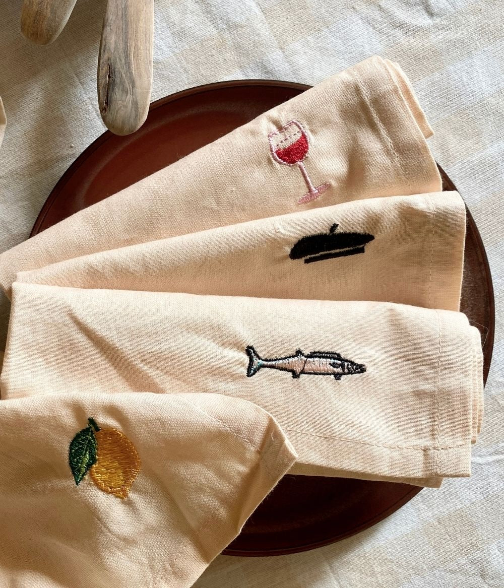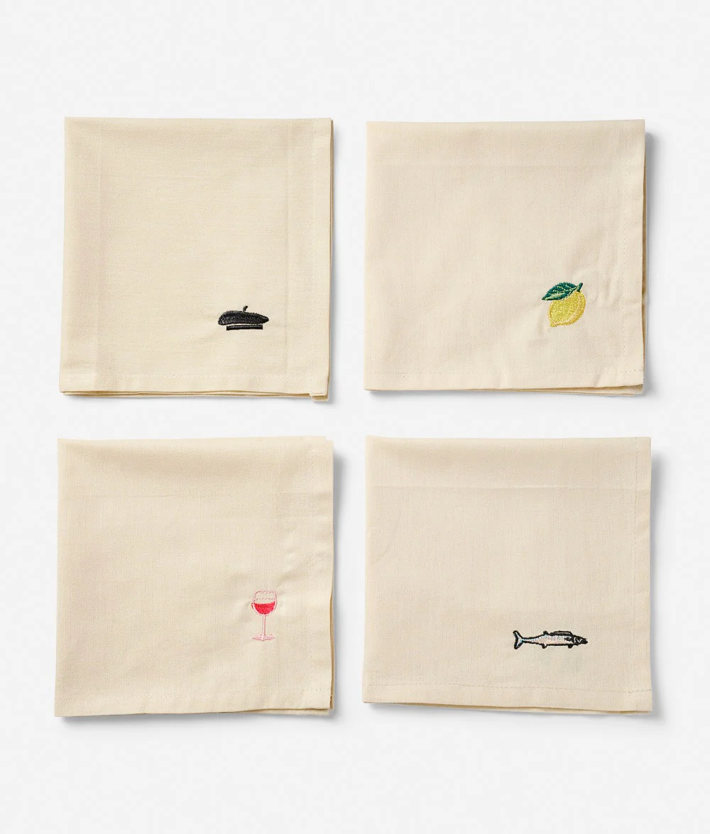 Dessa servetter säljs i set om fyra med fyra individuella broderier inspirerade av Frankrike. Servetterna är 40×40 cm och kan kombineras med Midnatts löpare och servetter.