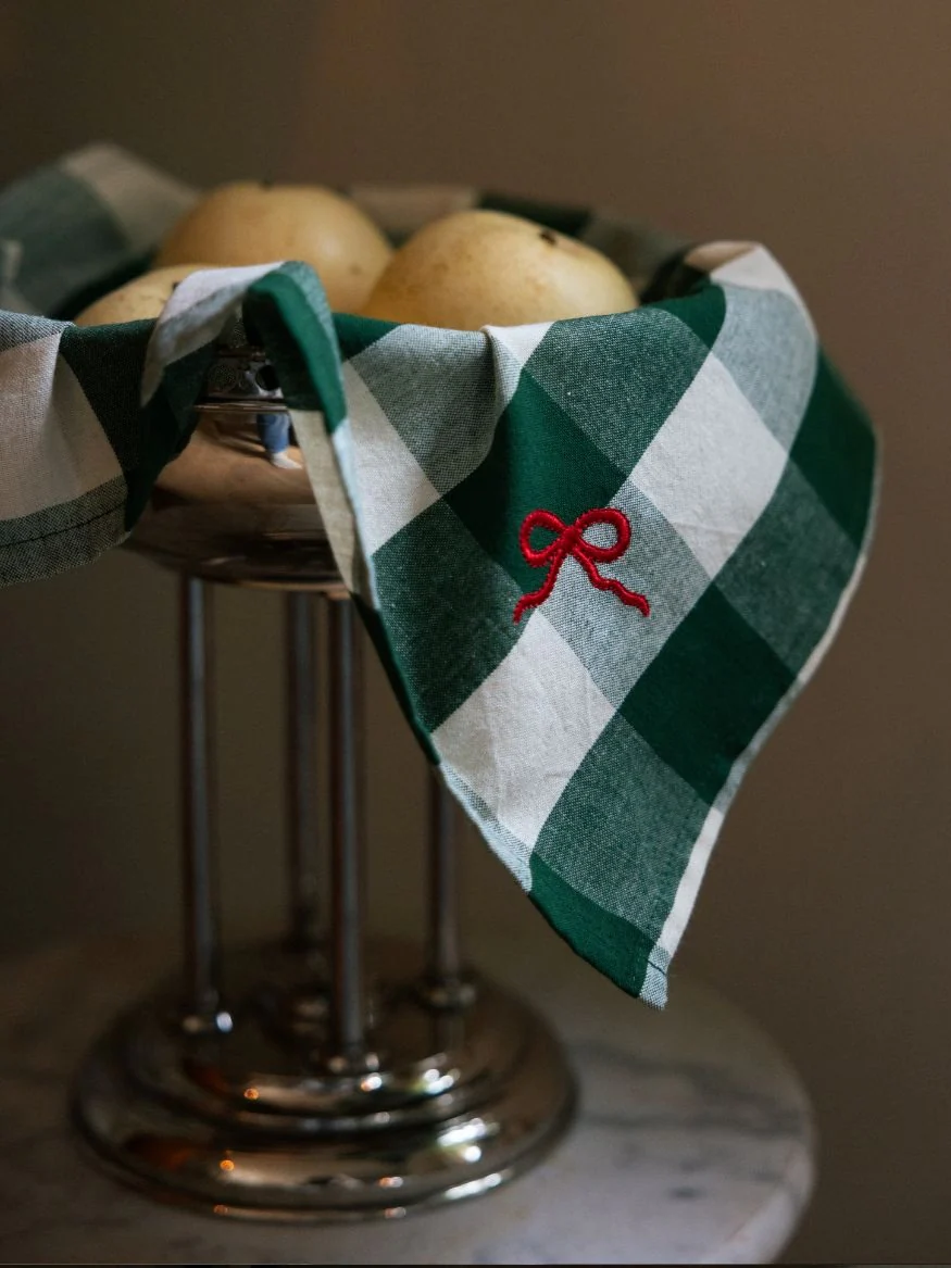 Det är ett grönt gingham-rutigt tyg med röd broderi av en rosett.
