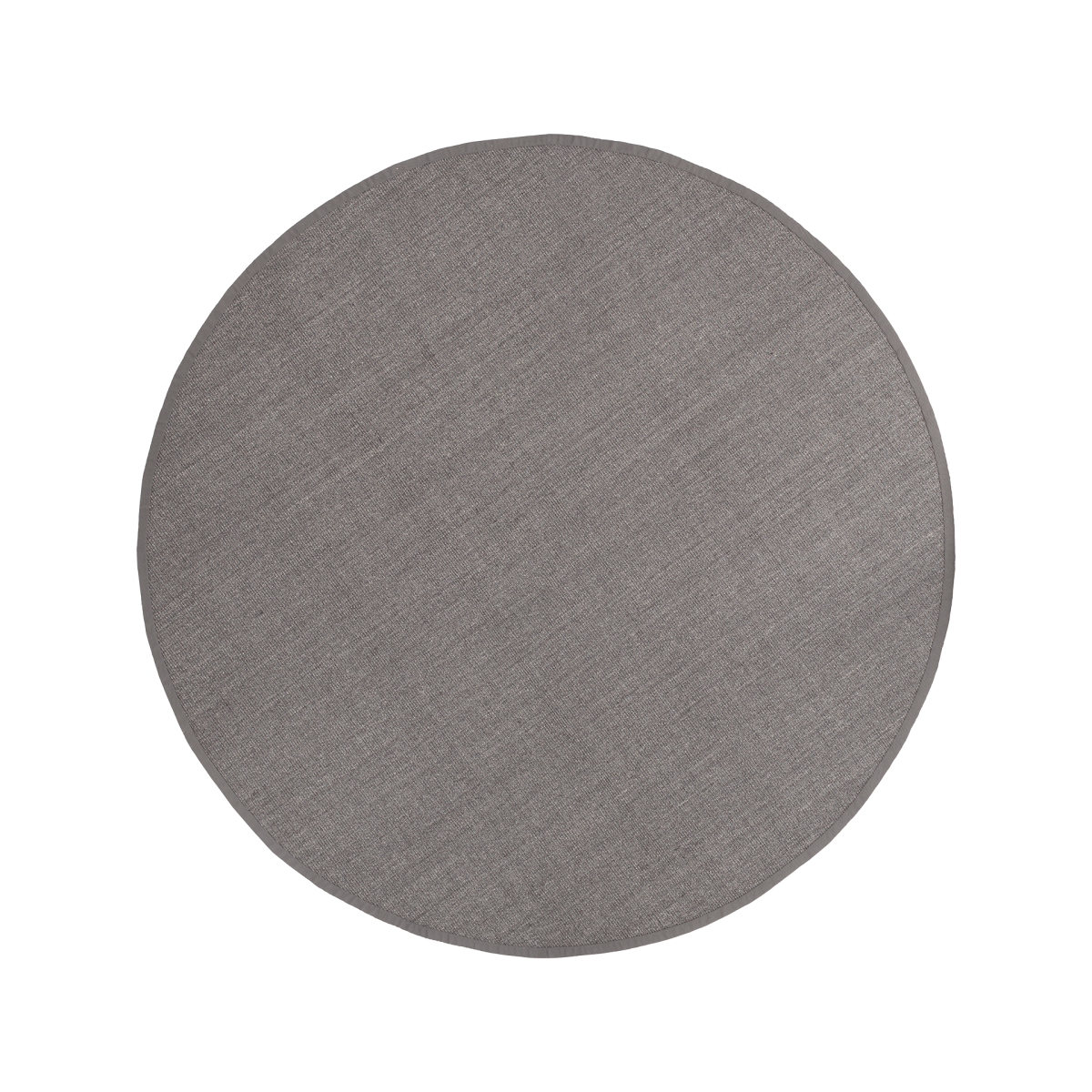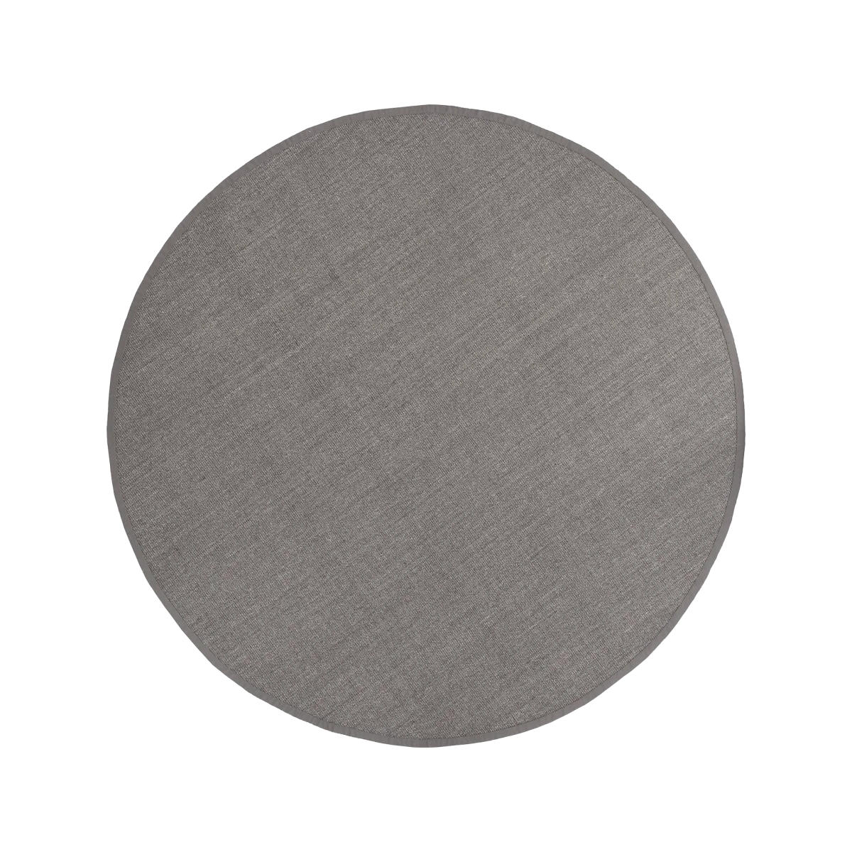 Slitstark stor rund matta av sisal med kant i grå bomull. För att mattan ska ligga snyggt på golvet är undersidan bestruken med naturlatex. Uppfyller kraven för OEKO-TEX STANDARD 100.