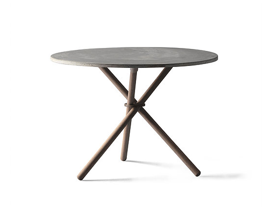 En bordsplatta av betong eller massiv ek, ben av massiv ek och en monteringsring i massivt stål eller mässing.