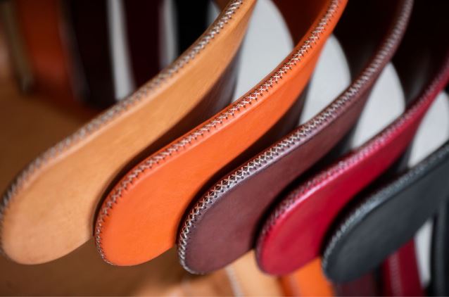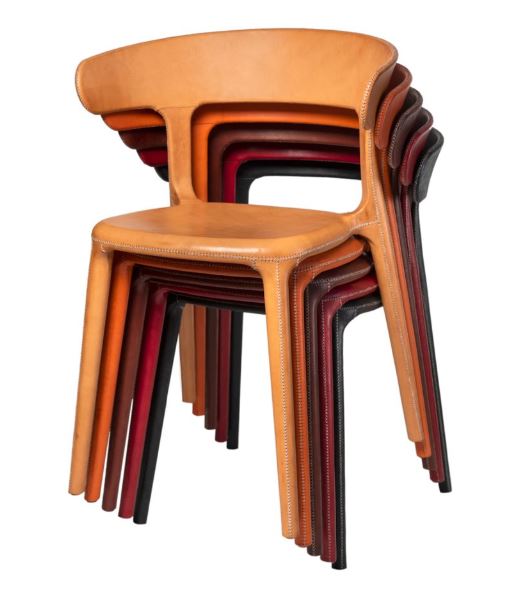 Matstol klädd i läder. Finns i natur, mörkbrunt, svart, orange och rött läder.