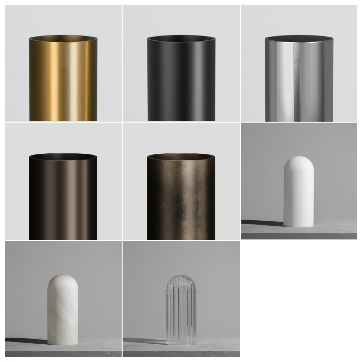 Lampan kan beställas i flera utföranden där både glaskupor och metallstomme finns i olika färger, vilket gör det möjligt att skapa en personlig kombination – exempelvis i mässing, brons, svart eller nickel – som passar sömlöst in i olika typer av inredningar. Den gedigna materialkvaliteten och den skulpturala designen ger ett exklusivt och tidlöst uttryck som lyfter såväl privata hem som offentliga miljöer.
