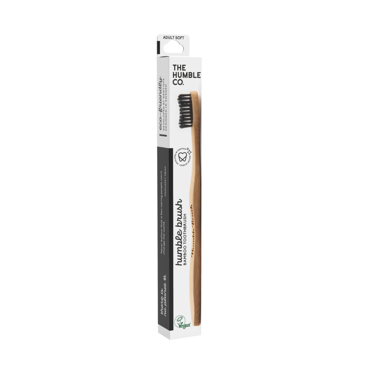The Humble Co. Tandborste för vuxen i färgen svart soft är en genomtänkt miljövänlig tandborste tillverkad av bambu med strån av nylon, helt fria från BPA. Tandborste av hög kvalitet med rundande spetsar. Med rätt skötsel håller tandborsten 2-3 månader. Mjuk tandborste som passar allas munnar. Miljövänlig förpackning för en hållbar framtid.