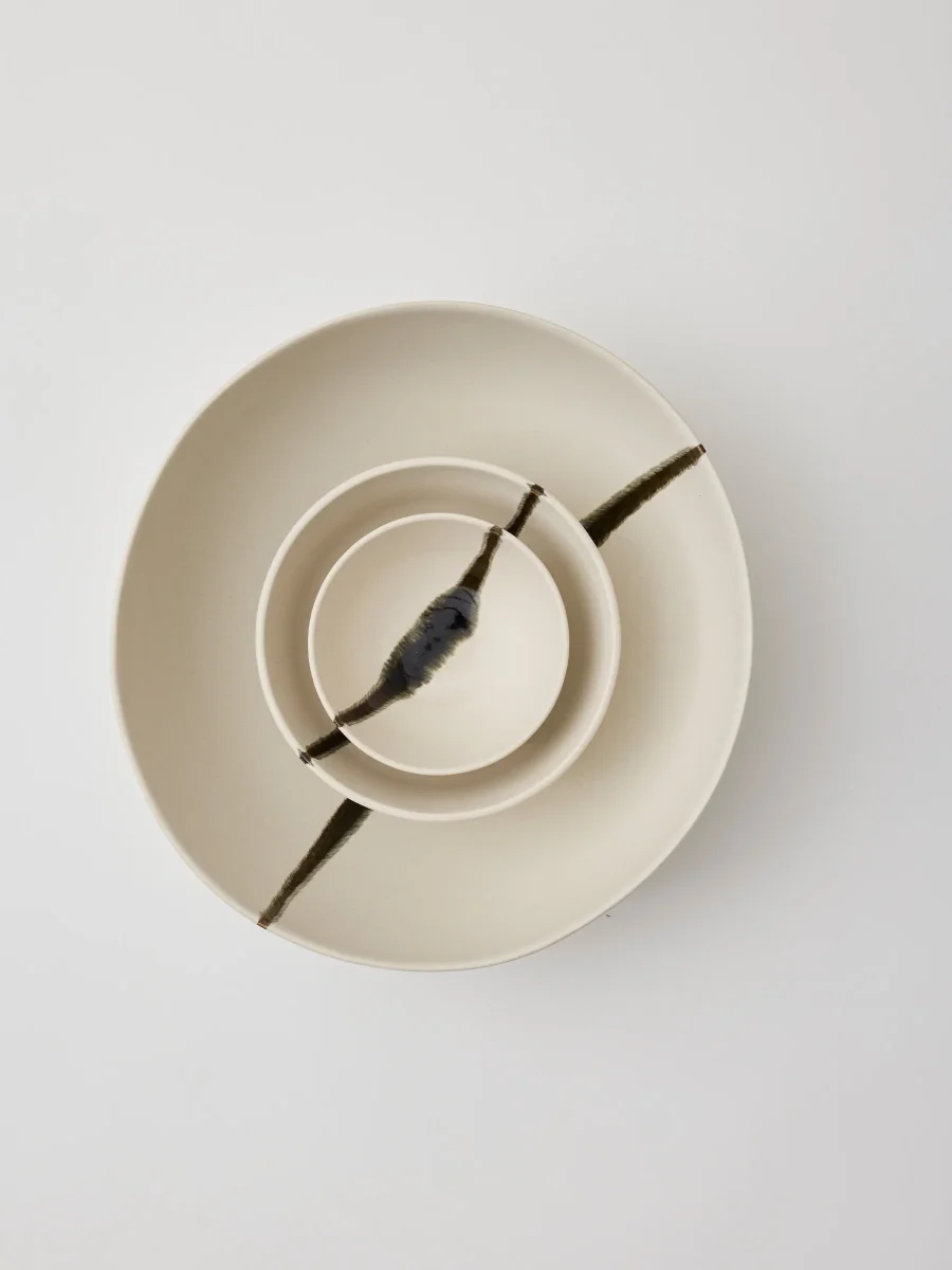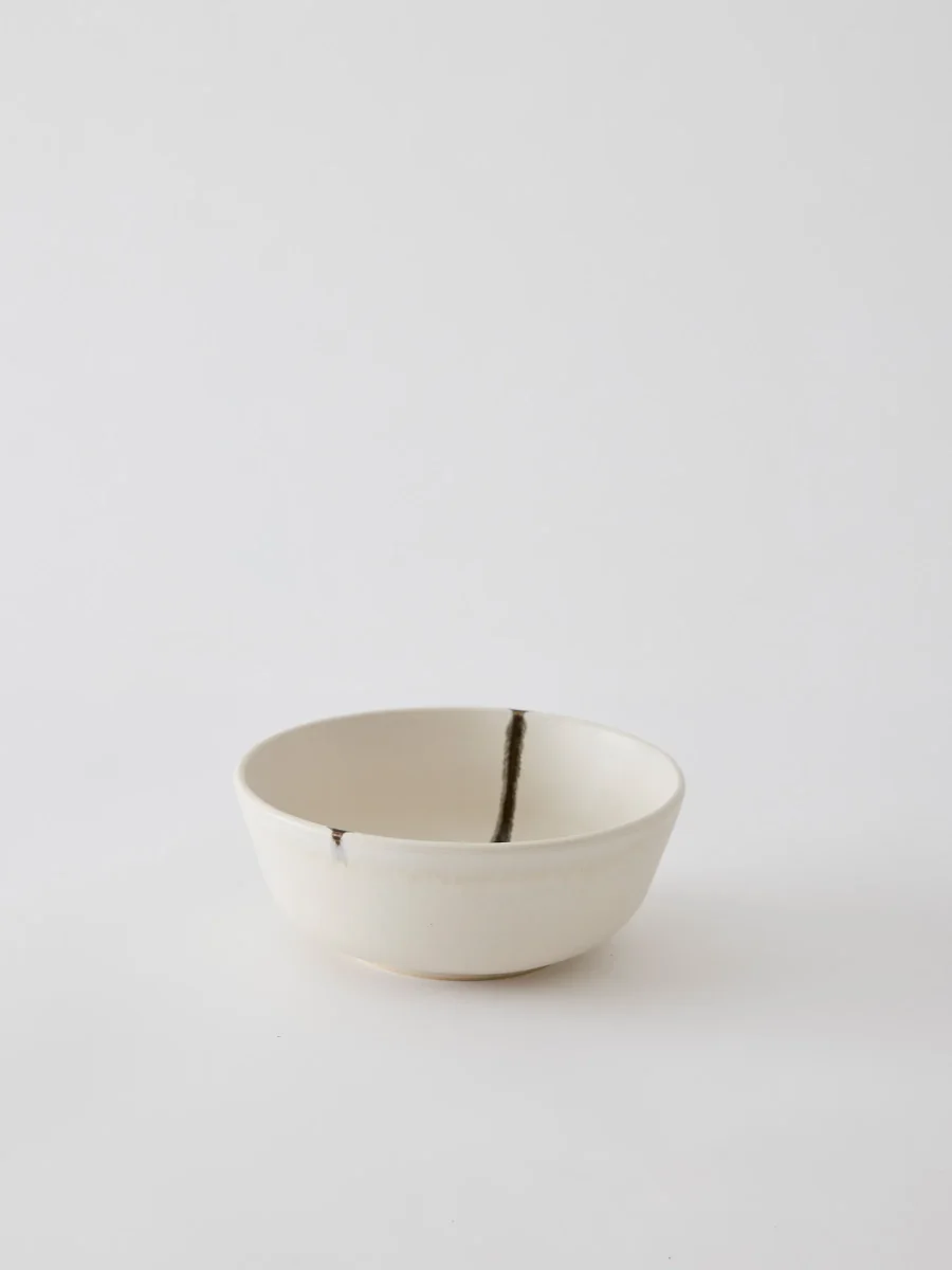 Handgjord serveringsskål från Toledo-serien i vit färg med en grön/svart inbränd linje som ger ett fint mönster i stengodset. Skålen är perfekt för att servera såser, snacks eller andra tillbehör. I Toledo-serien finns också en lite större skål.