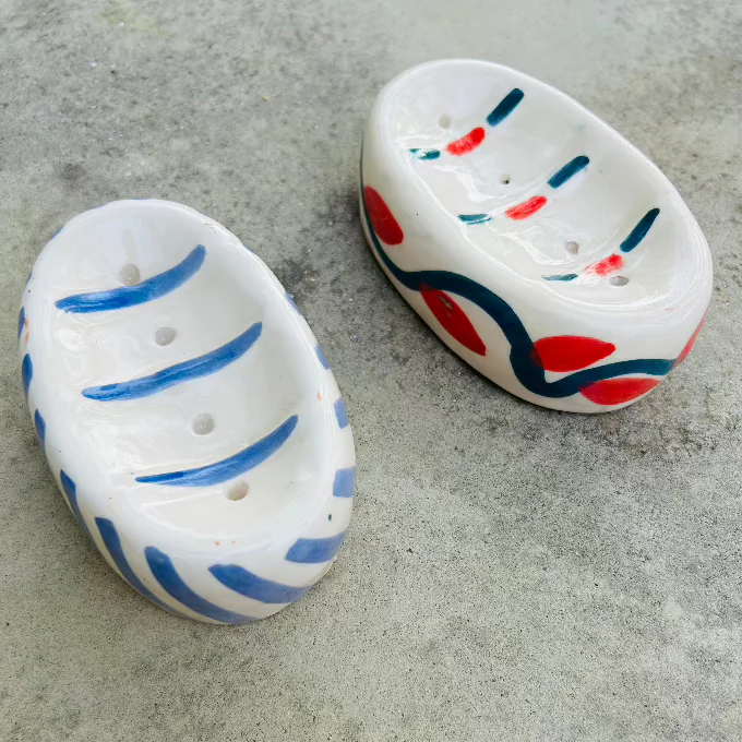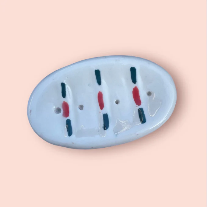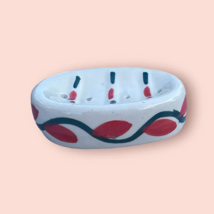 Ett vackert handgjort tvålfat i keramik i ett mönster med röda blad. Ett snyggt tillbehör till badrummet.