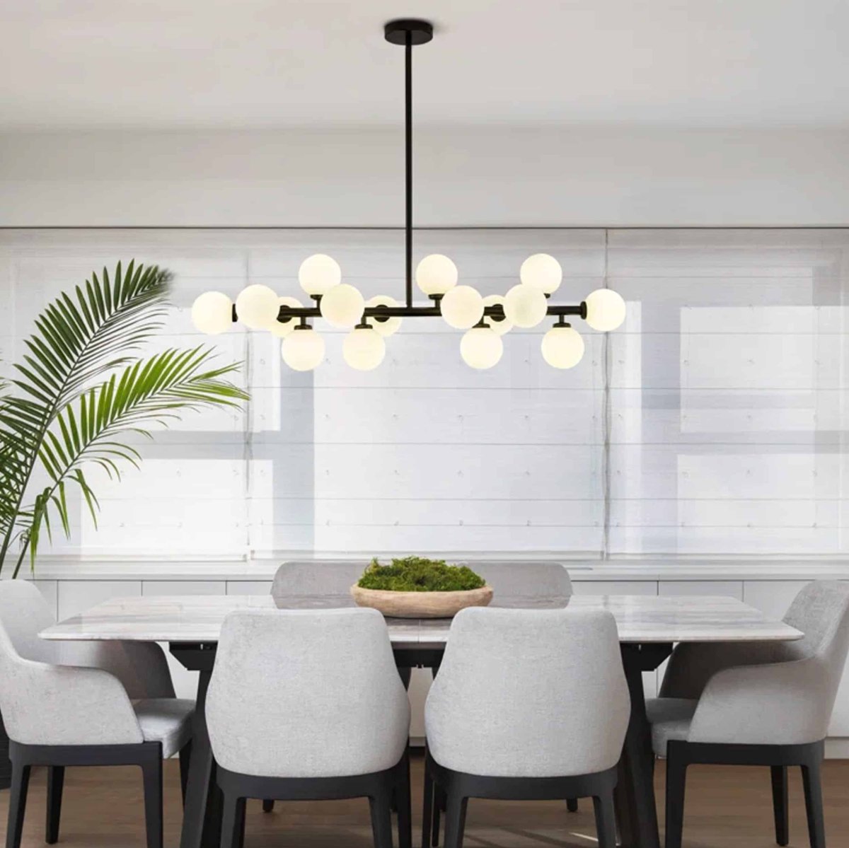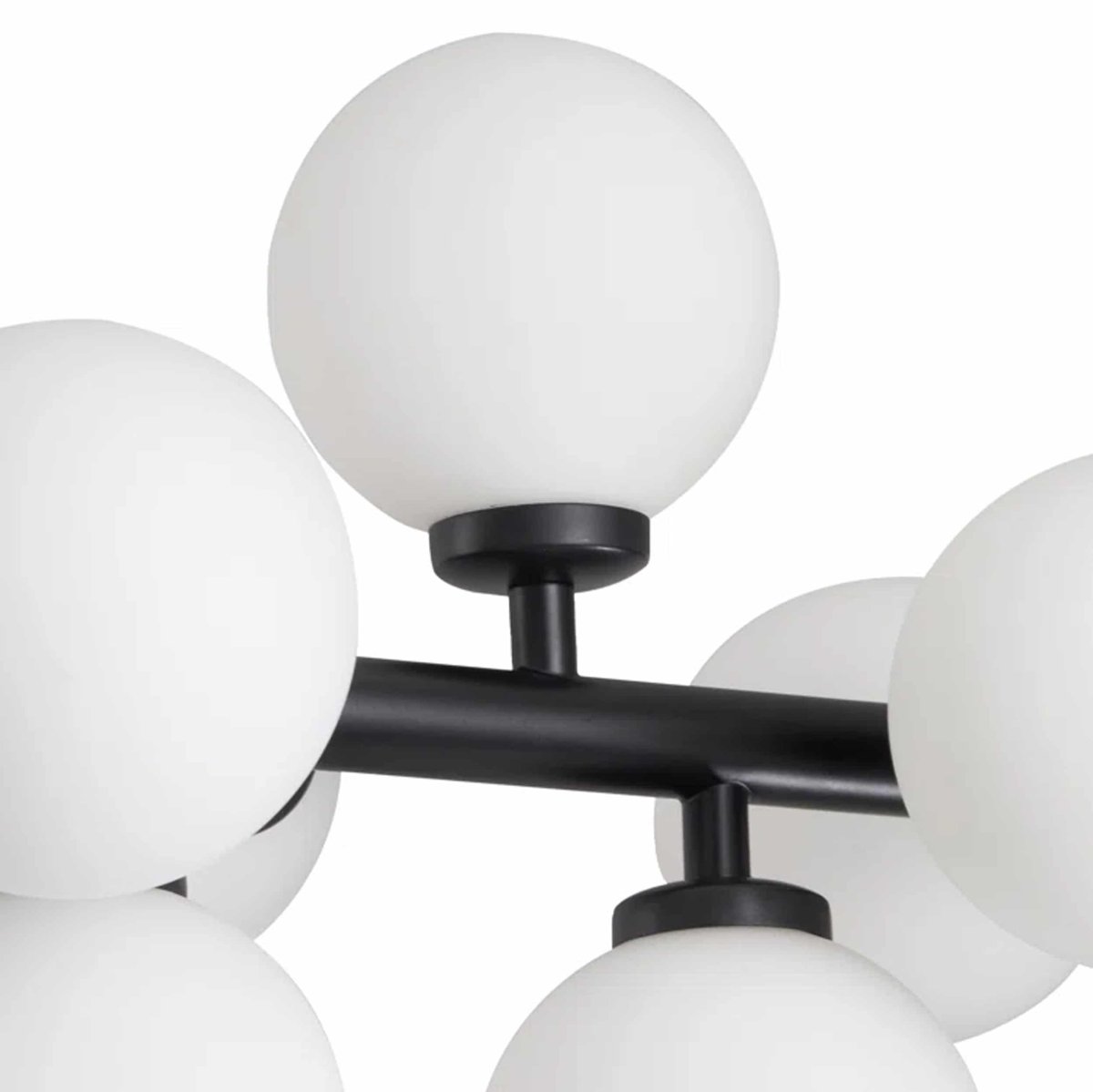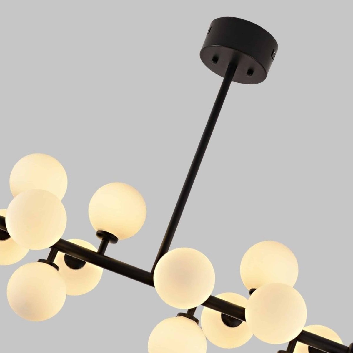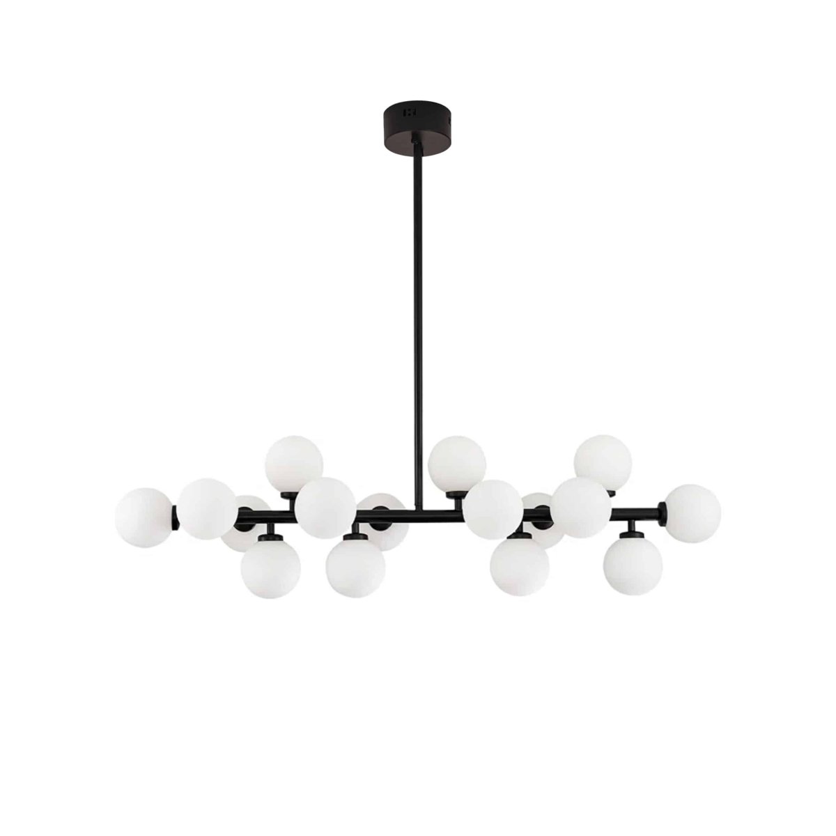 Modern variant av en ljuskrona och taklampa som påminner om molekyler som flyter på den långsträckta Mattsvartfärgade metallstommen. En elegant taklampa som med sin stilrena design passar i de allra flesta utrymmena. Förslagsvis i ett rum där du behöver extra bra belysning då lampan har 16 ljuskällor.