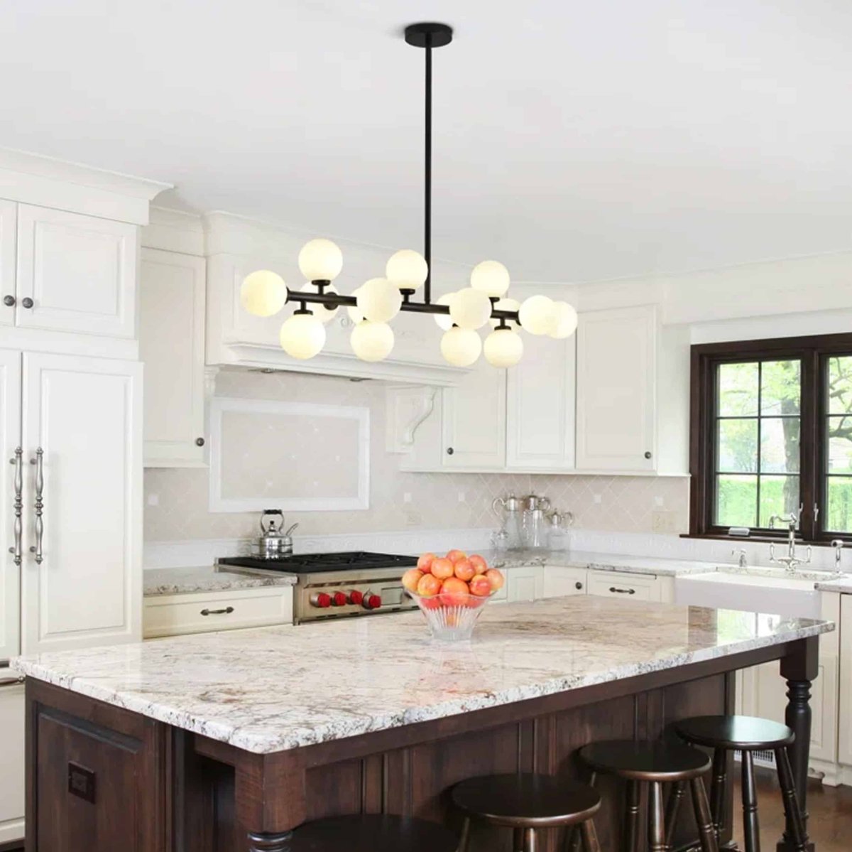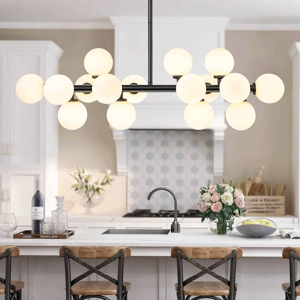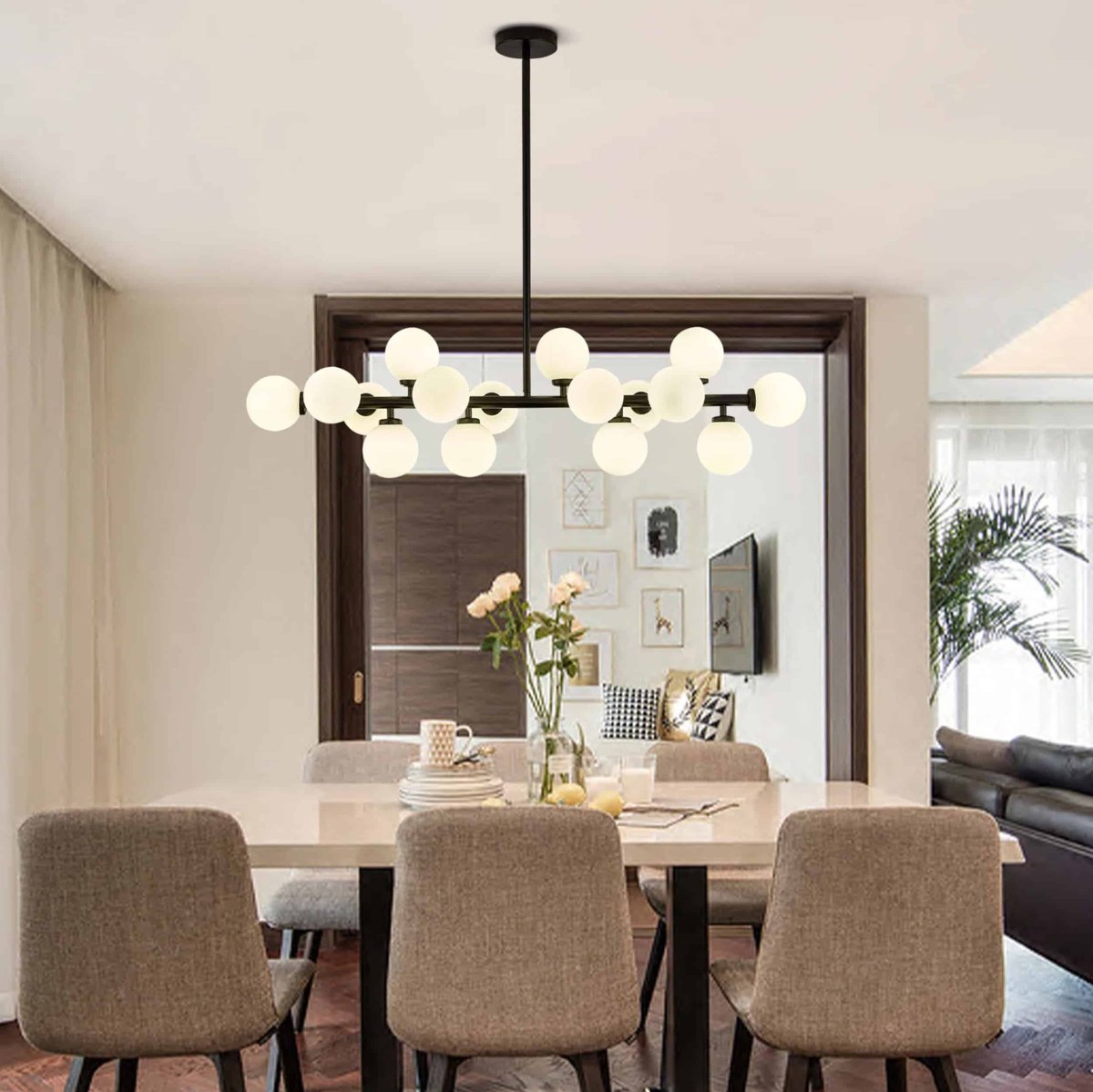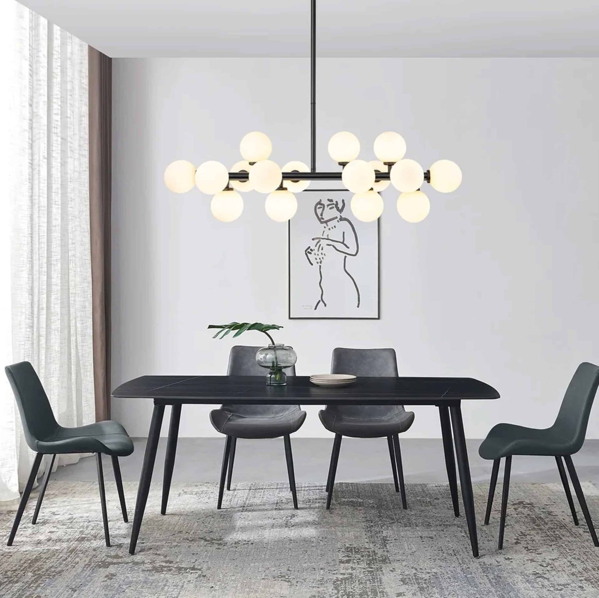 Modern variant av en ljuskrona och taklampa som påminner om molekyler som flyter på den långsträckta Mattsvartfärgade metallstommen. En elegant taklampa som med sin stilrena design passar i de allra flesta utrymmena. Förslagsvis i ett rum där du behöver extra bra belysning då lampan har 16 ljuskällor.